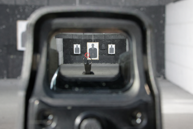 ホロサイトを覗くと見えてくる光の模様(レティクル)を標的に合わせて、あとは引き金を引くだけ。